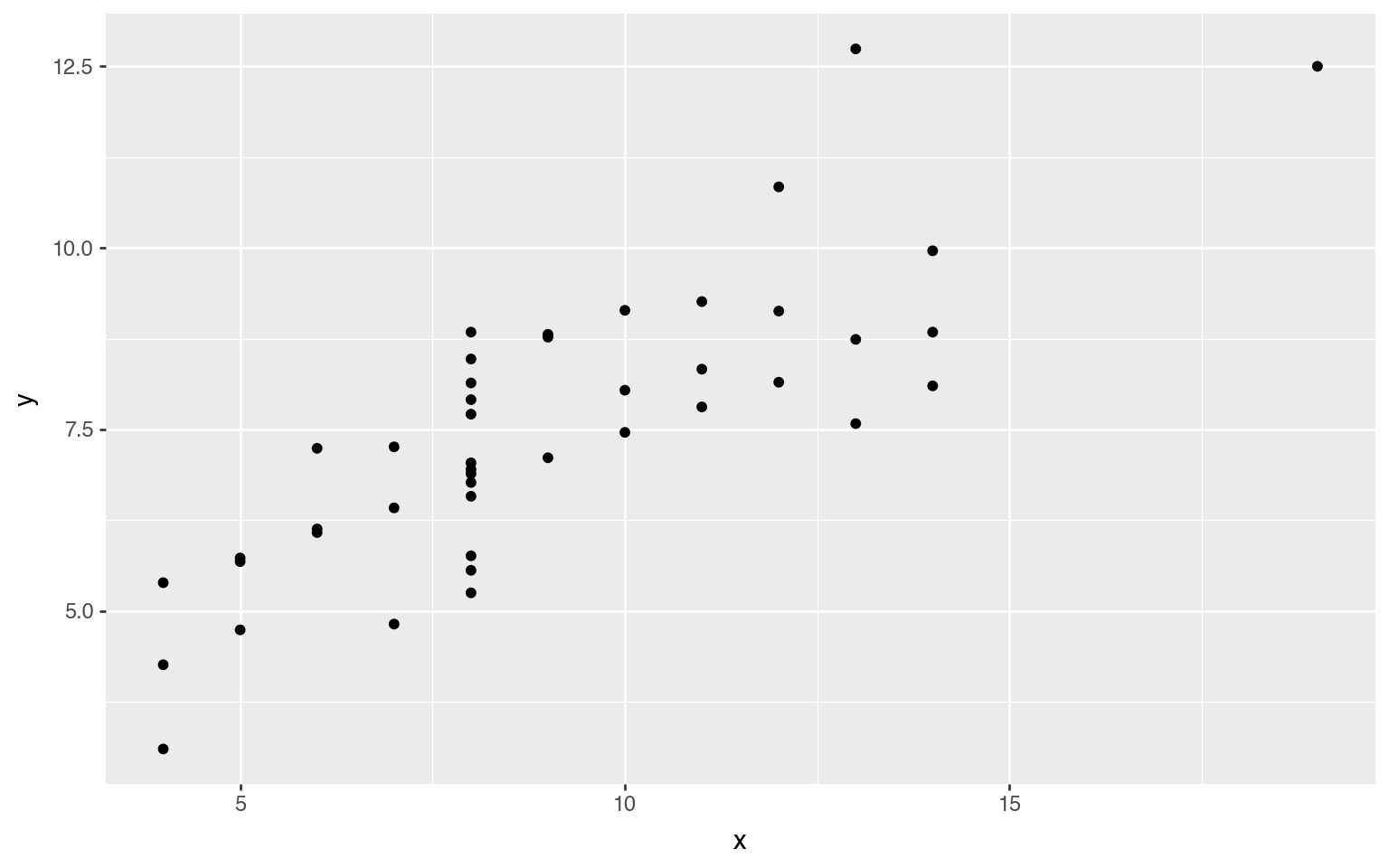 ggplot(anscombe_quartet, aes("x", "y")) + geom_point()