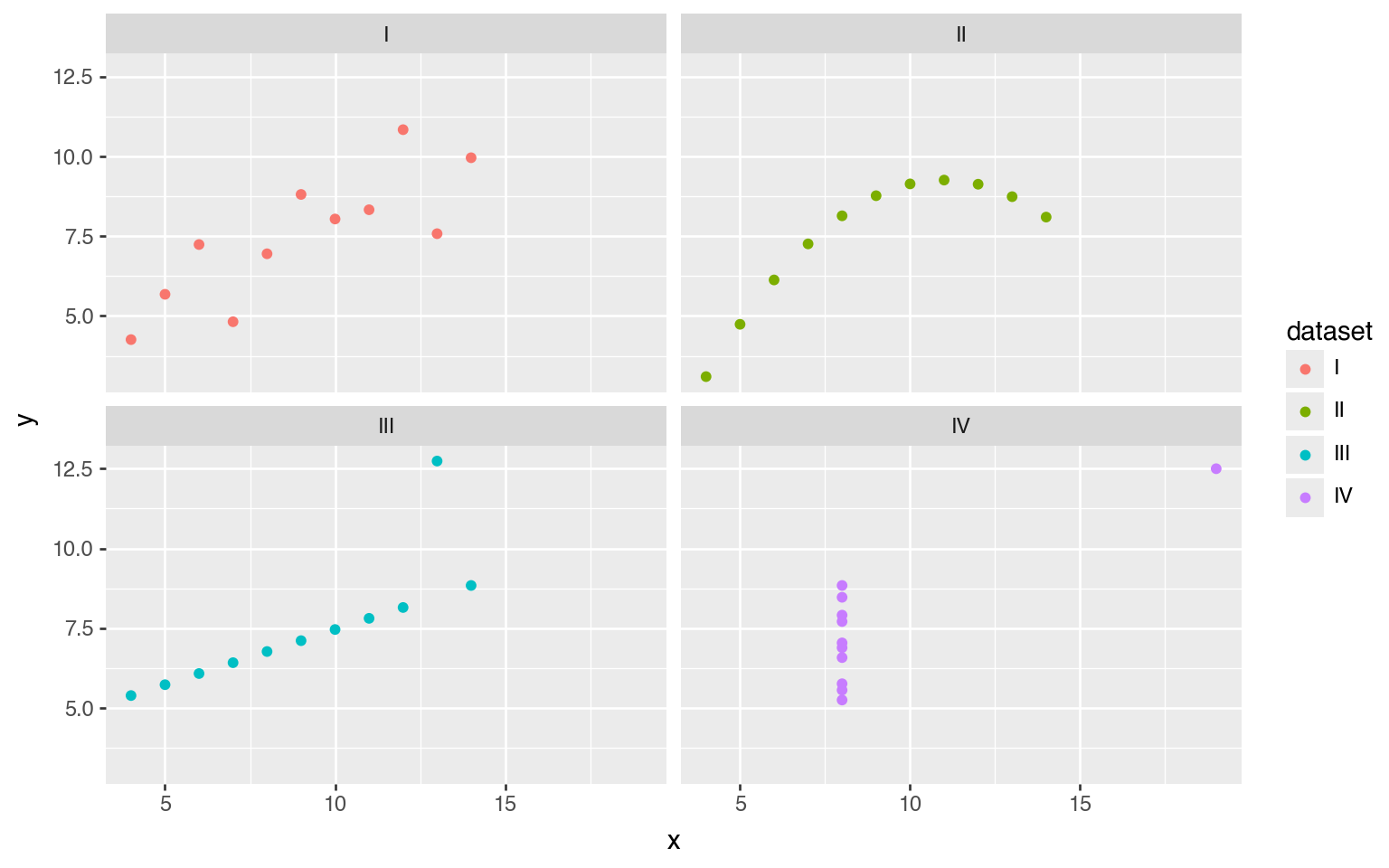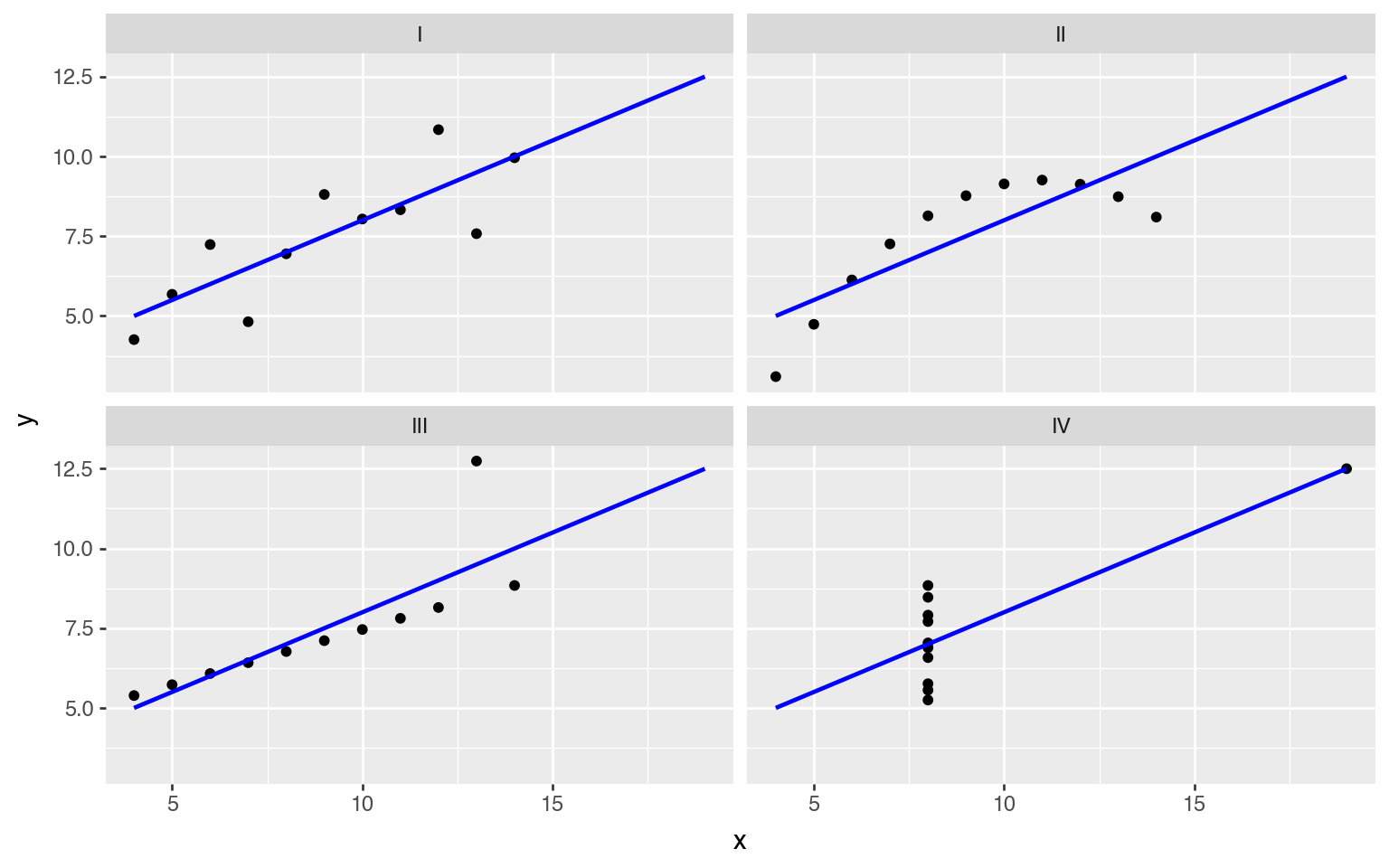 That’s better. The panels make the use of color redundant, so we’ll make each point black again. Let’s also add a regression line using the geom_smooth() function, to visualize that the four datasets have identical descriptive statistics.